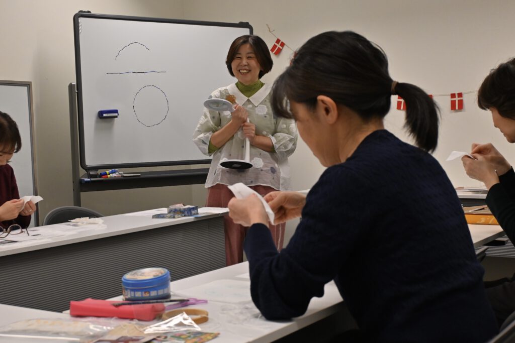 刺繍講師の仕事は始めたばかりですが、留学先から足を伸ばしてノルウェー、ドイツ、イギリス、イタリアなど、近隣国の白糸刺繍の本場へも足を運んできた見聞は、自身のデンマーク刺繍をお伝えするのに役立つと思っています。